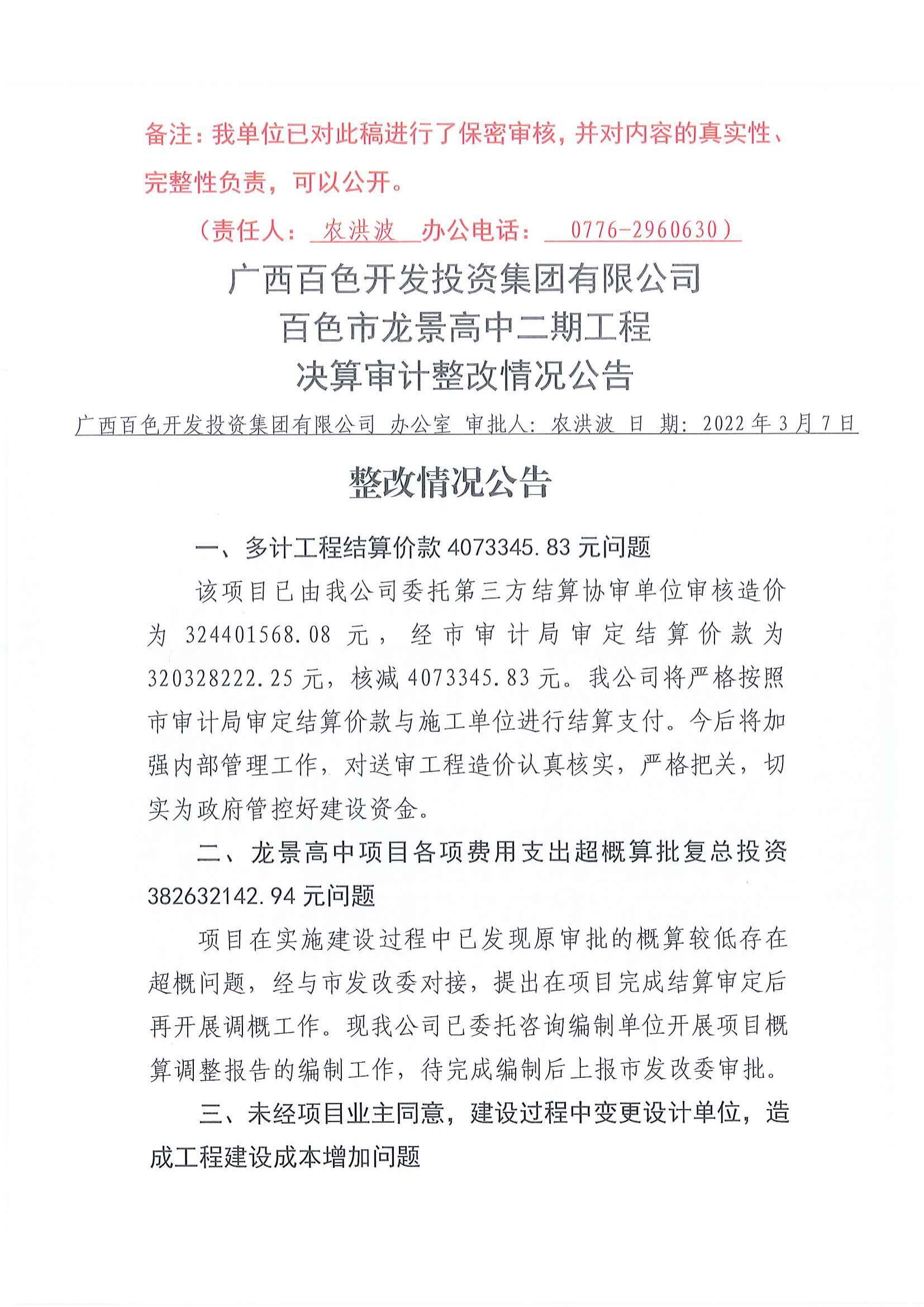 百色市龍景高中二期工程竣工決算審計整改情況公告